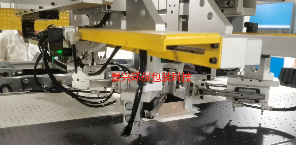 下面是裱紙與成型的紙板貼合對(duì)位,此過程也完全由設(shè)備自動(dòng)完成,再進(jìn)入下一個(gè)貼盒工序。